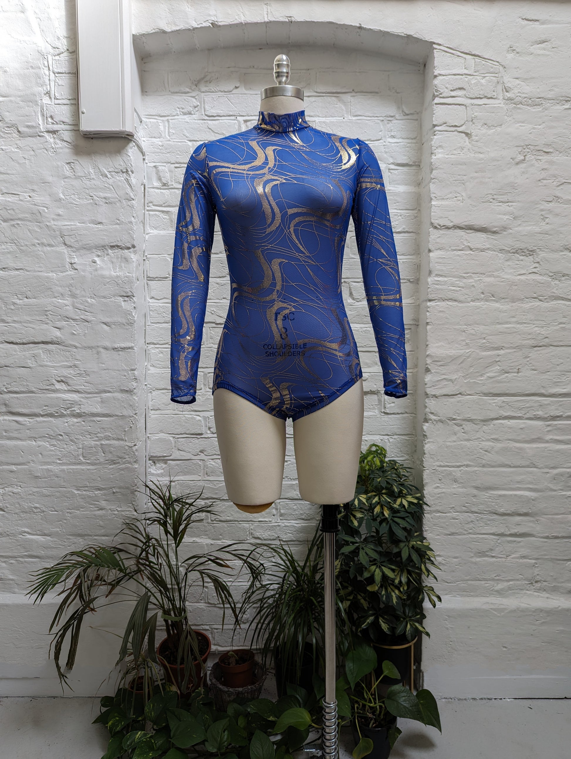 A sleek blue mesh leotard with gold foiling swirl details. High neck and a key-hole back allow this to be worn over any base or used to layer under a costume.