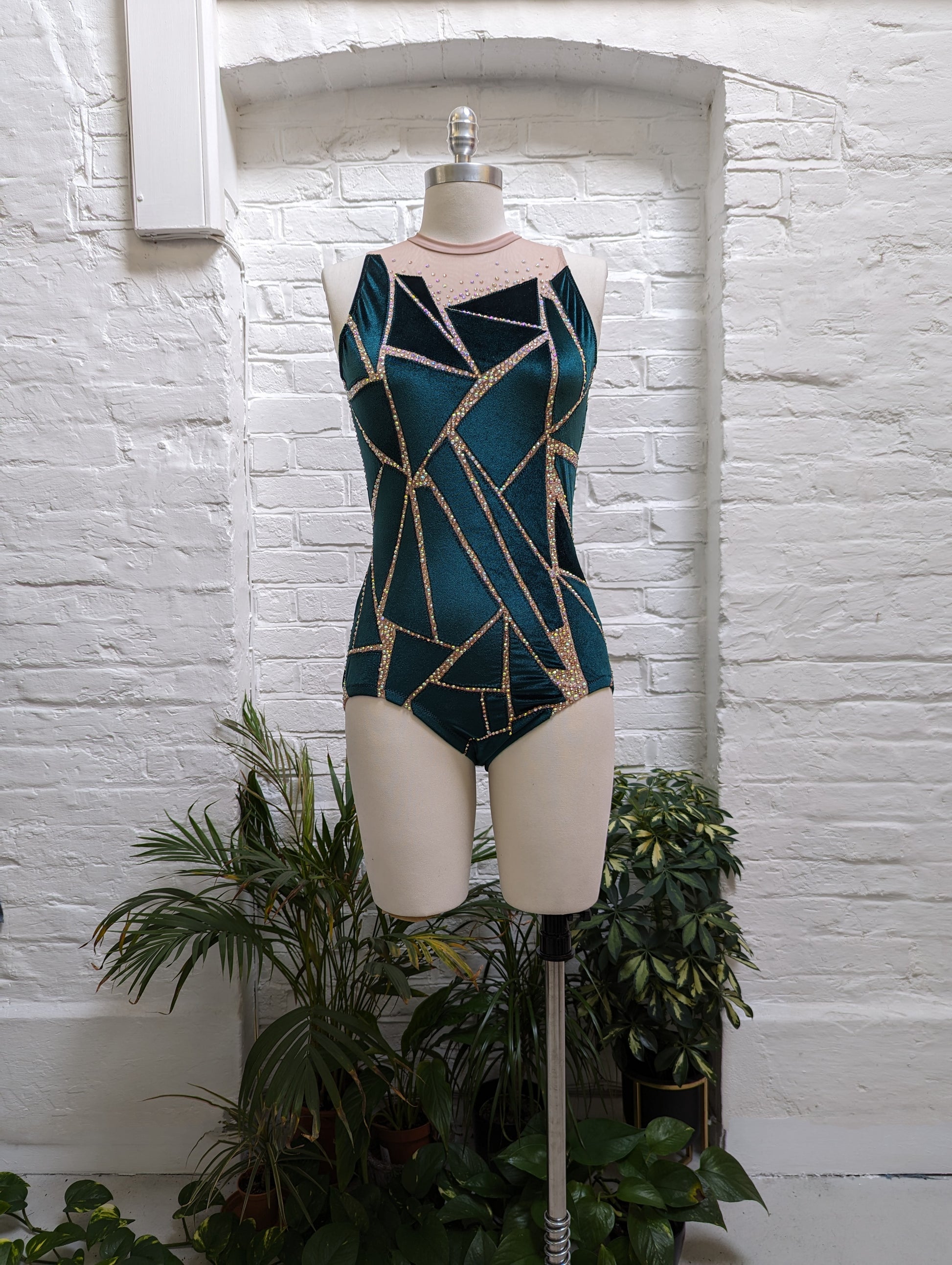 A mesh based leotard with green velvet panels and a key-hole back design. Decorated with quality coloured and AB glass rhinestones for extra colour and sparkle.